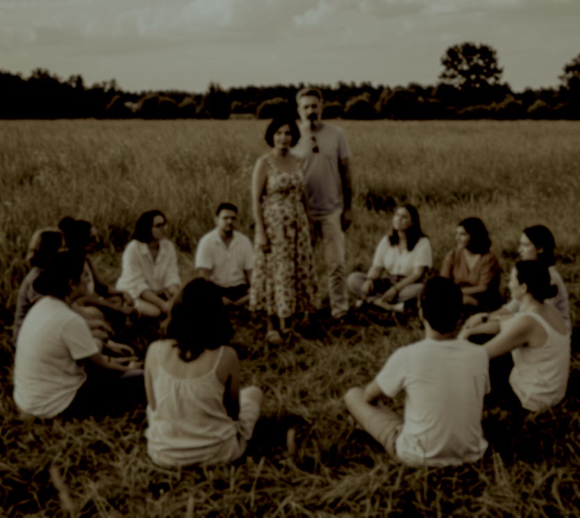 The scene changes, and we stand beside each other at the edge of the clearing in a meadow surrounded by a dark forest. There is a group of people with us, sitting in a circle on the ground, ostensibly seekers after deeper truth.